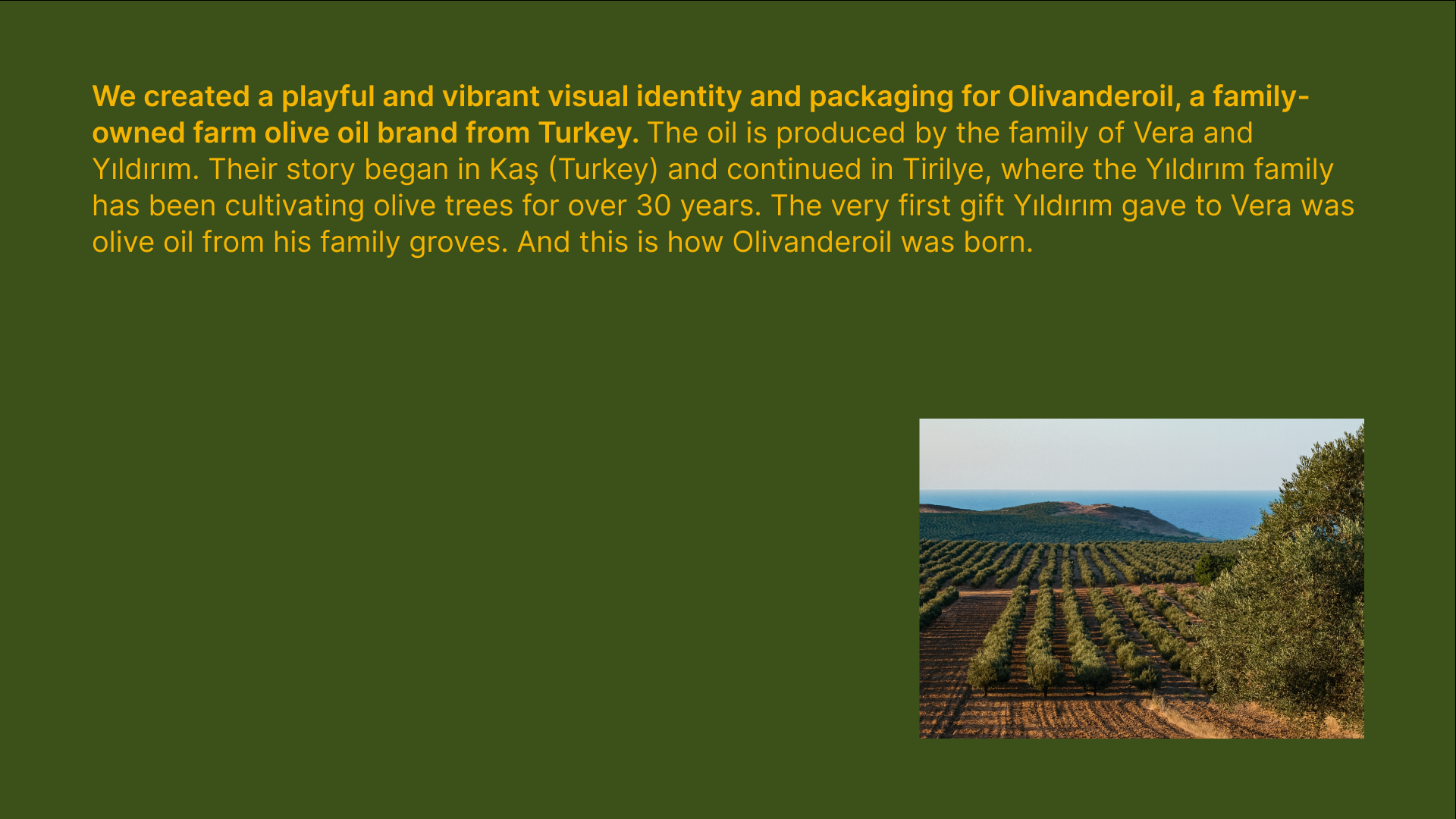 Playful and vibrant identity and packaging for Olivanderoil, a family-owned farm olive oil brand from Turkey.